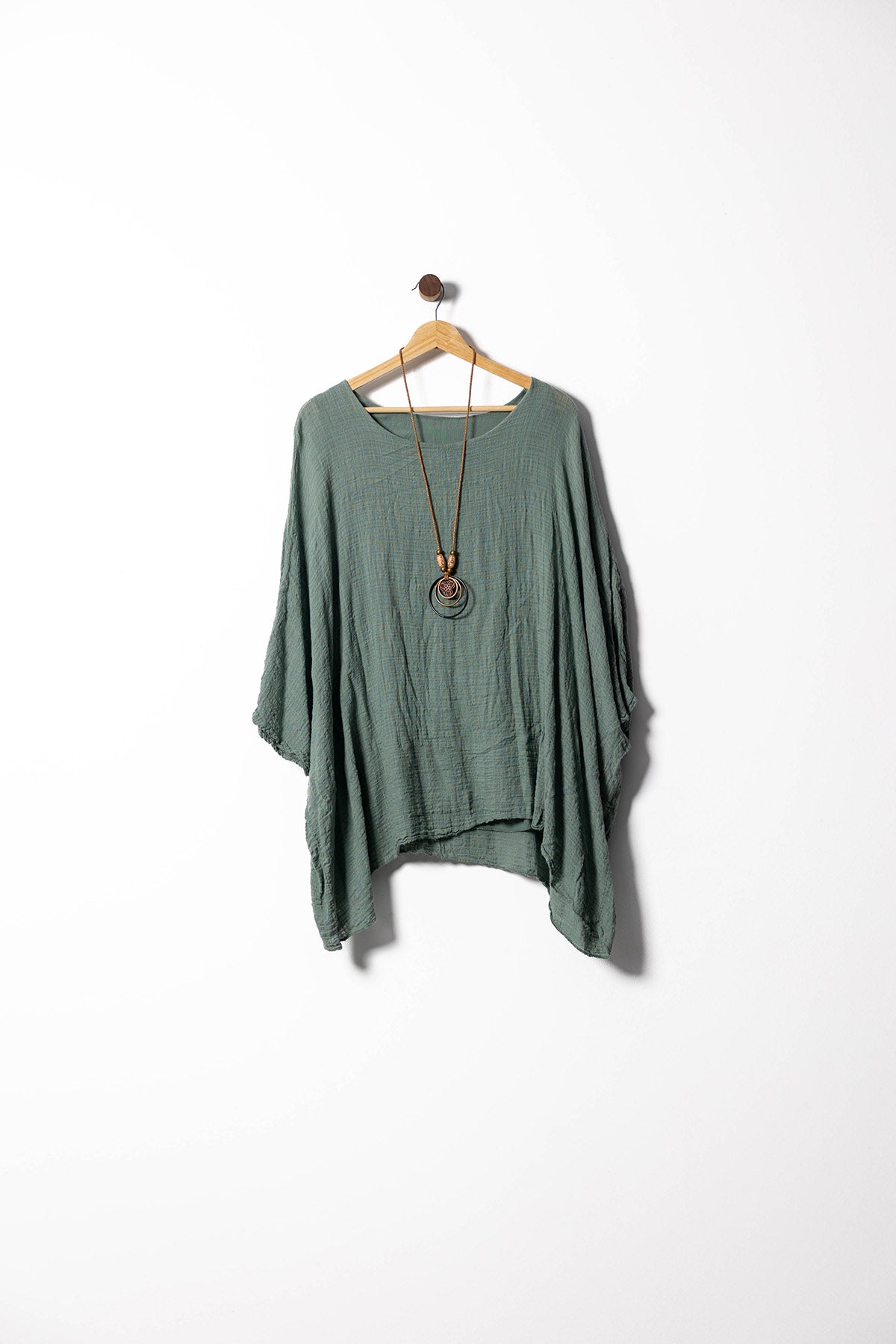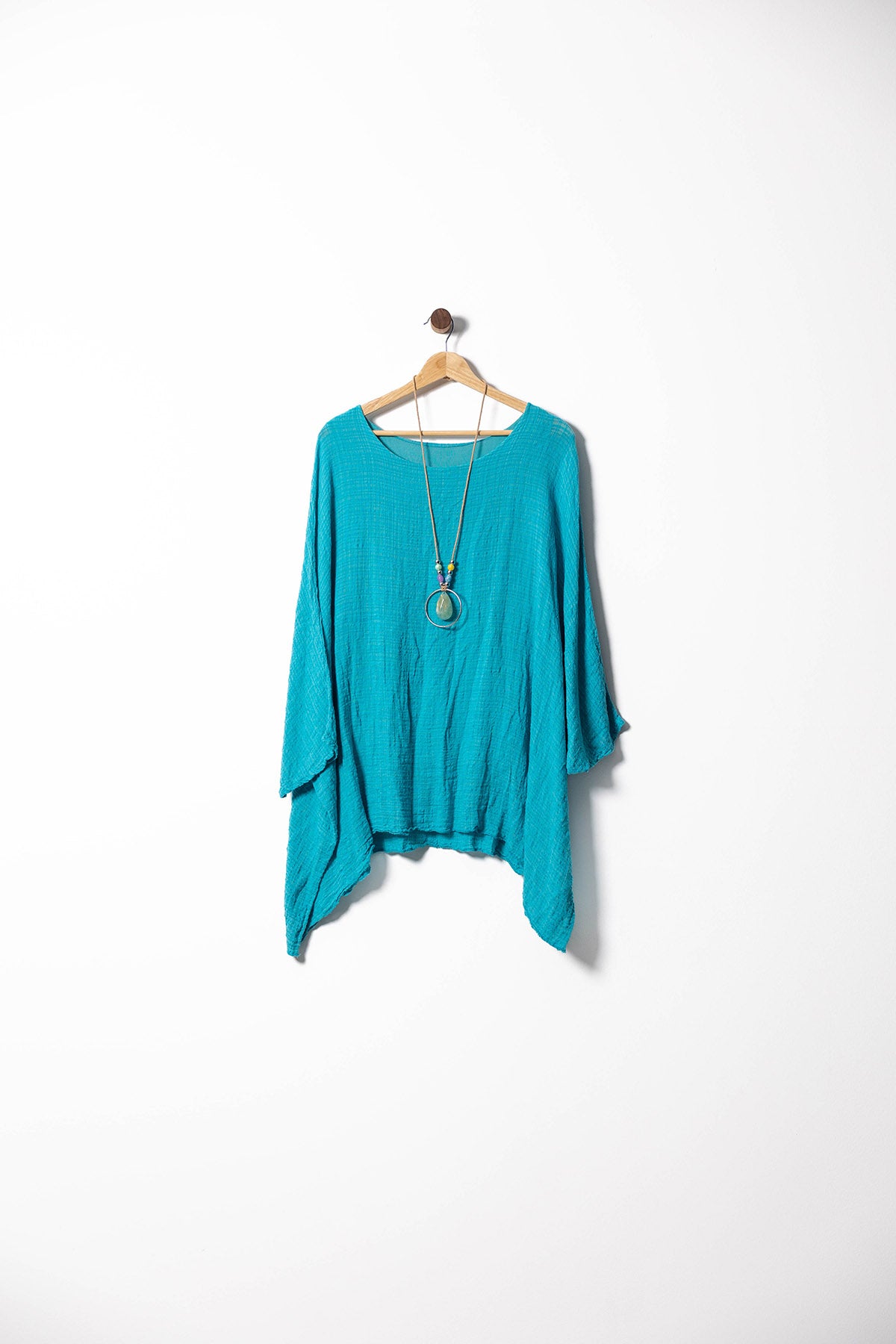 Add a relaxed boho vibe to your wardrobe with this flowy linen poncho blouse. Lightweight and breathable, it features an airy oversized fit, asymmetrical hem, and a round neckline. Comes with a statement long necklace for a complete, easy-going look. Perfect for sunny days, beach strolls, or casual outings. Available in olive green, mustard yellow, burnt orange, natural beige, and vibrant turquoise.