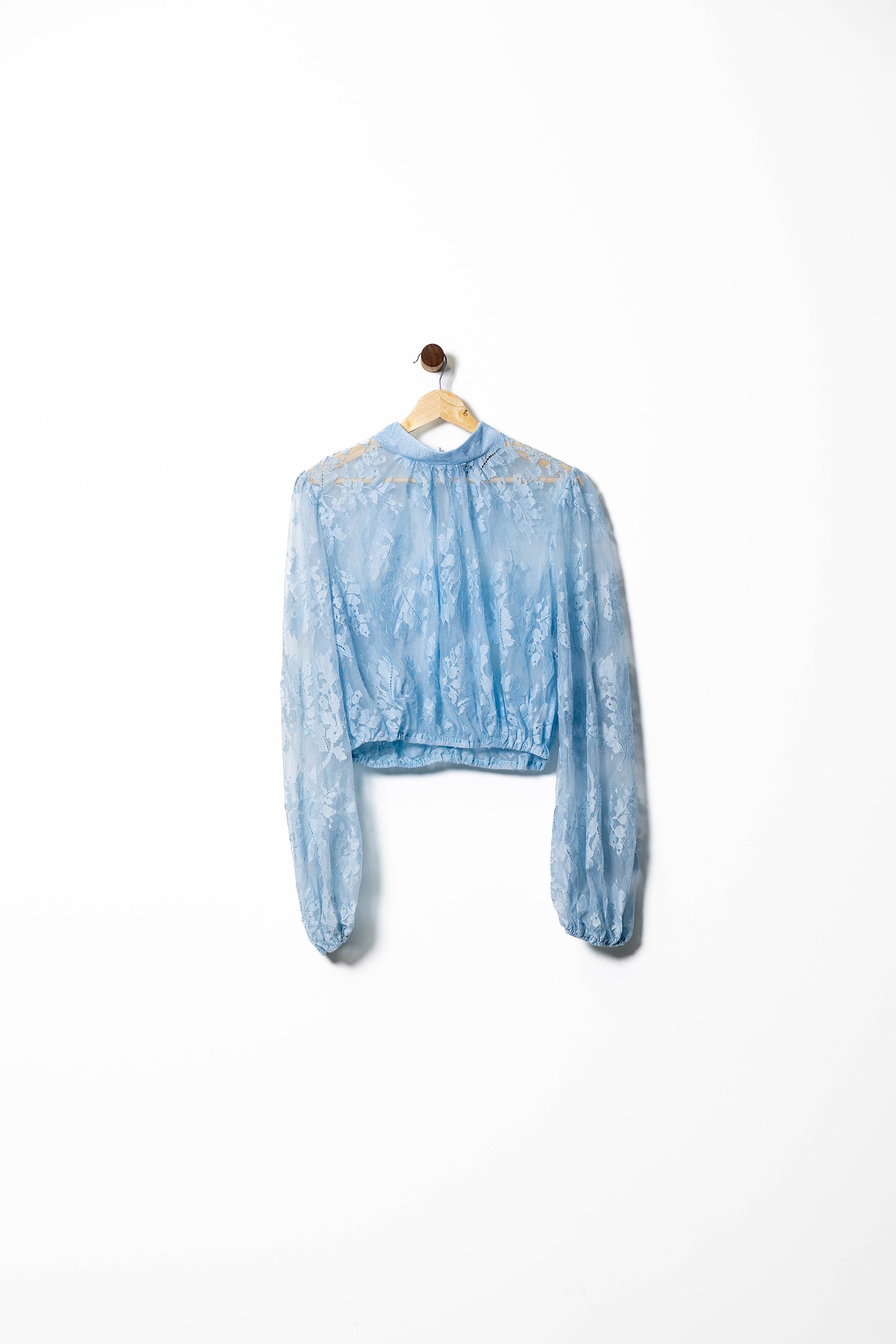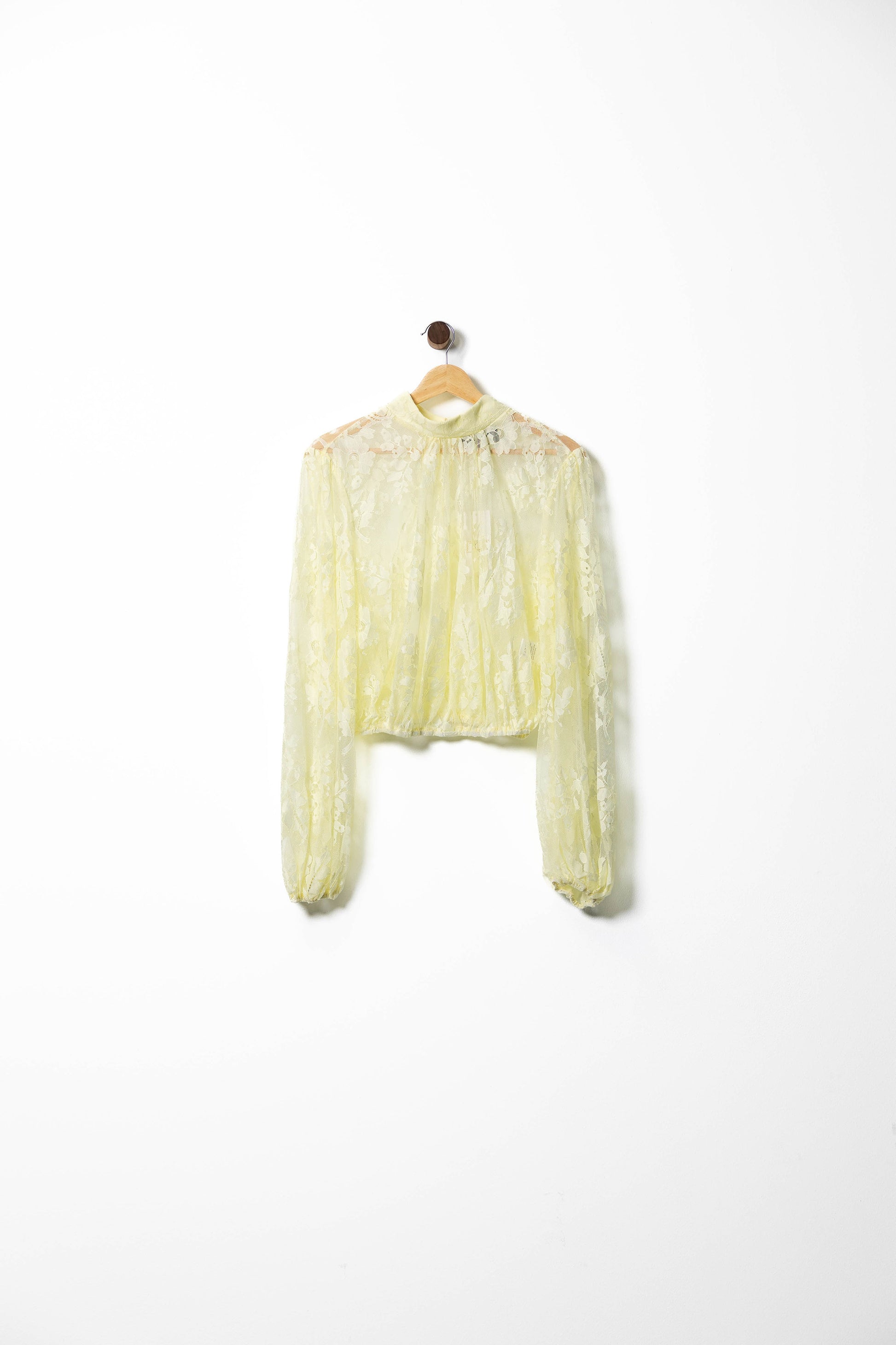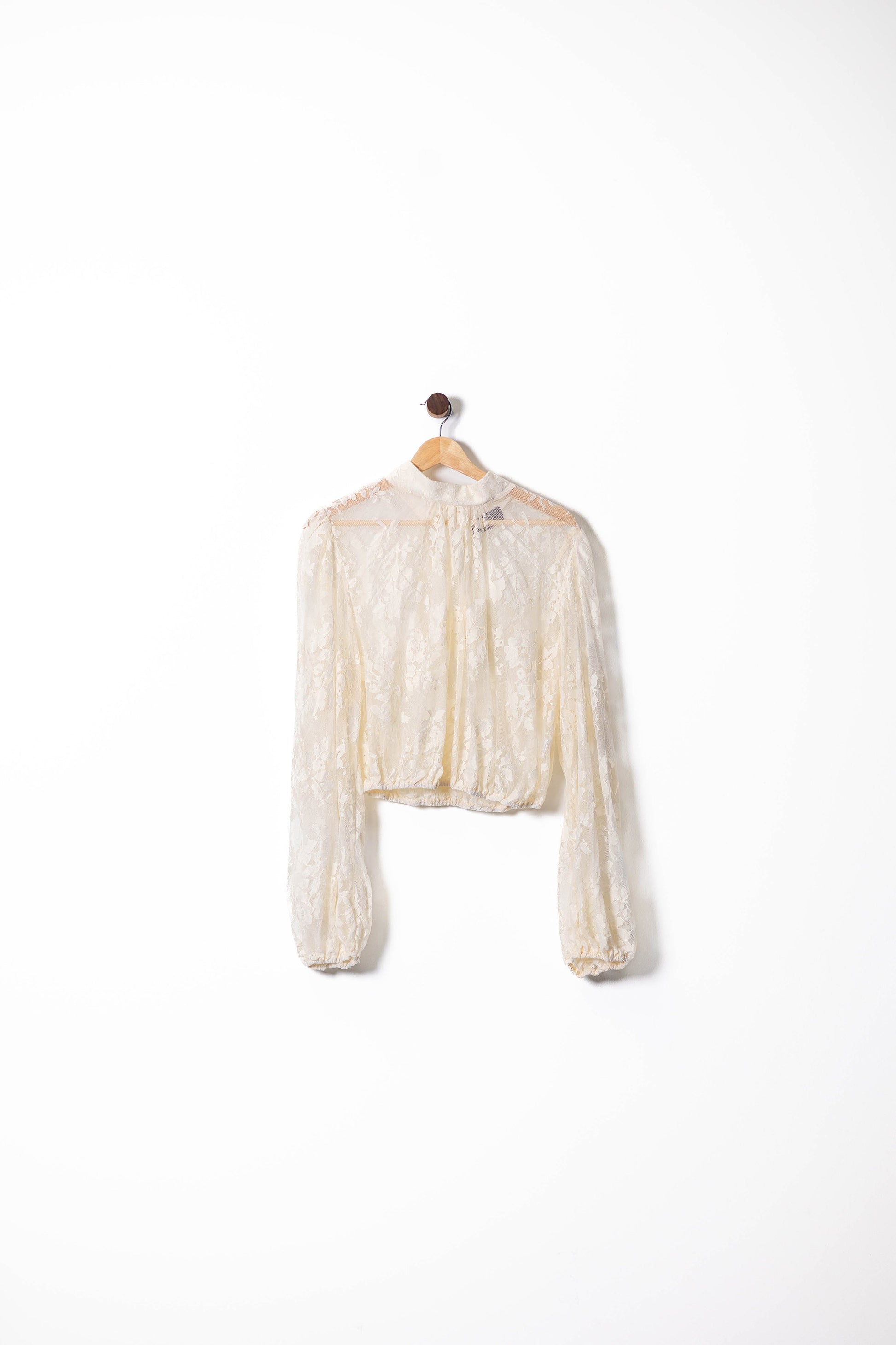 Delicate and romantic, this ivory sheer blouse features an allover lace design with subtle floral motifs that exude vintage charm. The high neckline and voluminous long sleeves add elegance, while the elasticated hemline creates a flattering cropped silhouette. Ideal for layering over camis or bralettes, it’s perfect for date nights, garden parties, or adding a feminine touch to tailored trousers and skirts.