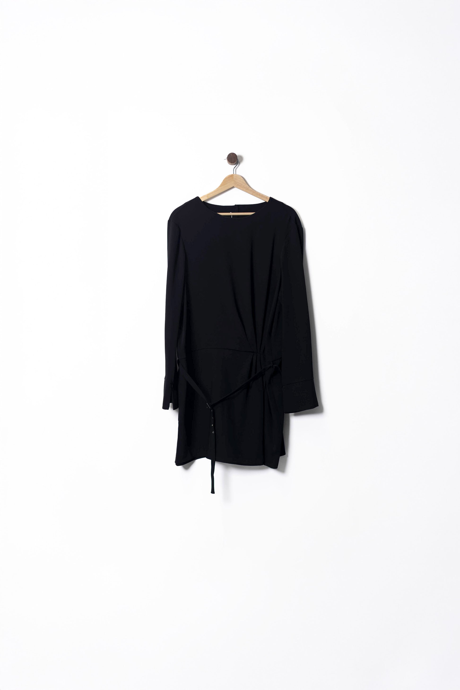 Effortlessly chic, this long-sleeve black tunic dress features a flattering tie-waist detail and clean, minimal silhouette. Dress it up with heels or keep it cool with boots—versatile, timeless, and easy to wear from day to night.