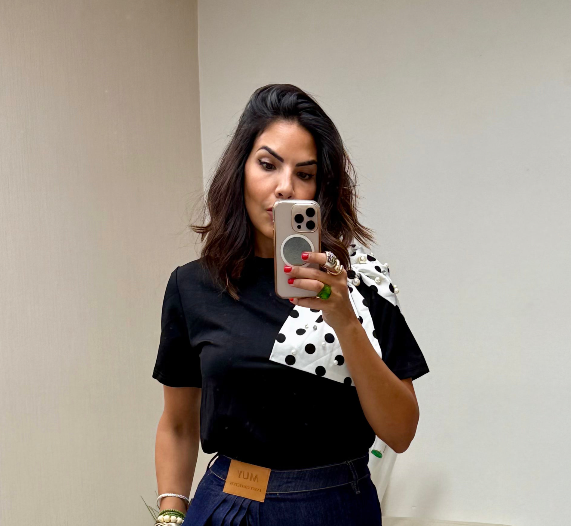 Playful, chic, and a little bit cheeky. The Polka-Dot Shoulder Bow Tee takes your everyday black tee and gives it a couture wink with a bold bow detail. Black-and-white dots keep it classic, while the oversized shoulder tie makes it a conversation starter. Wear it tucked into denim or paired with sleek trousers—this top is where casual meets statement.