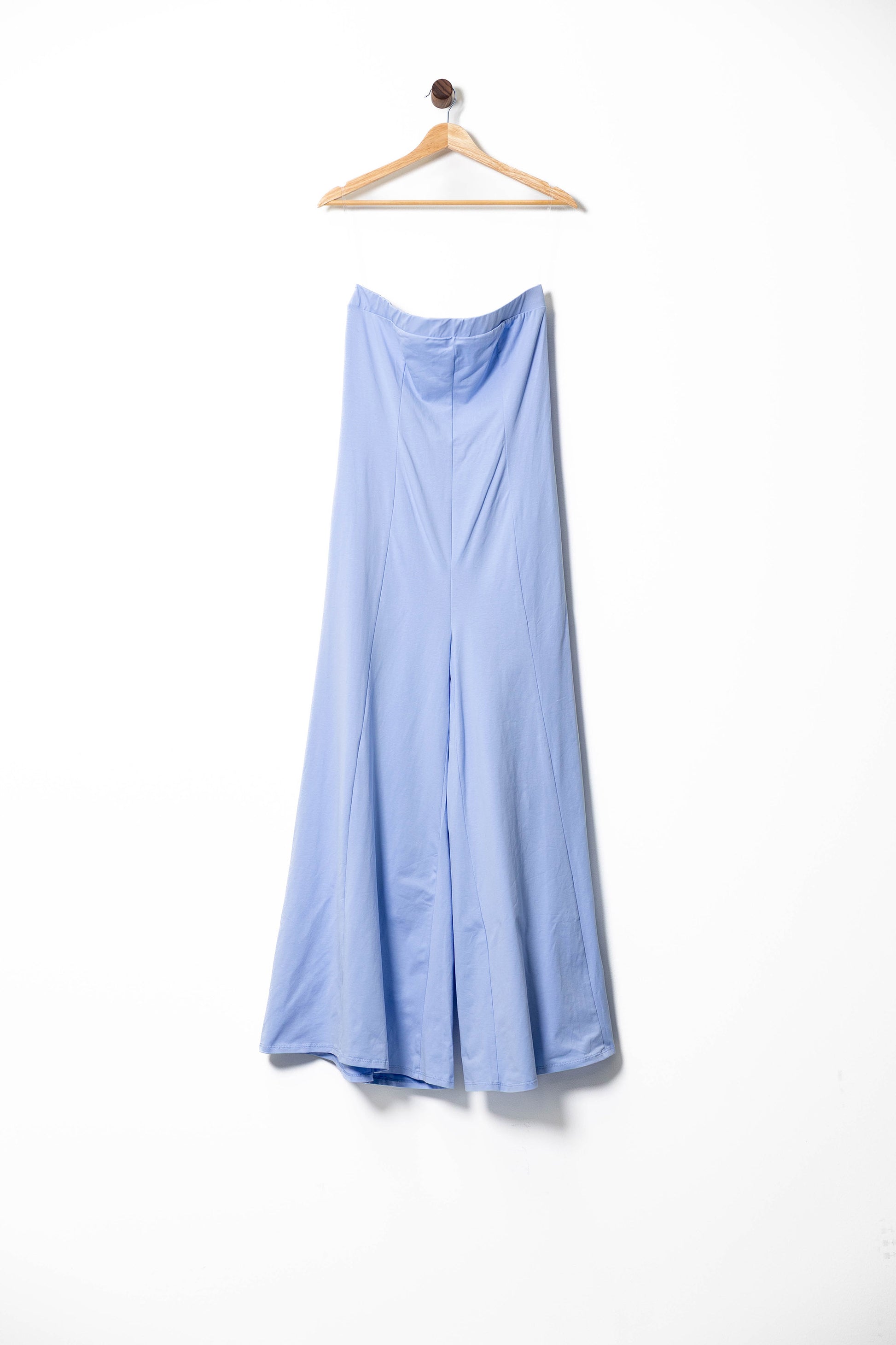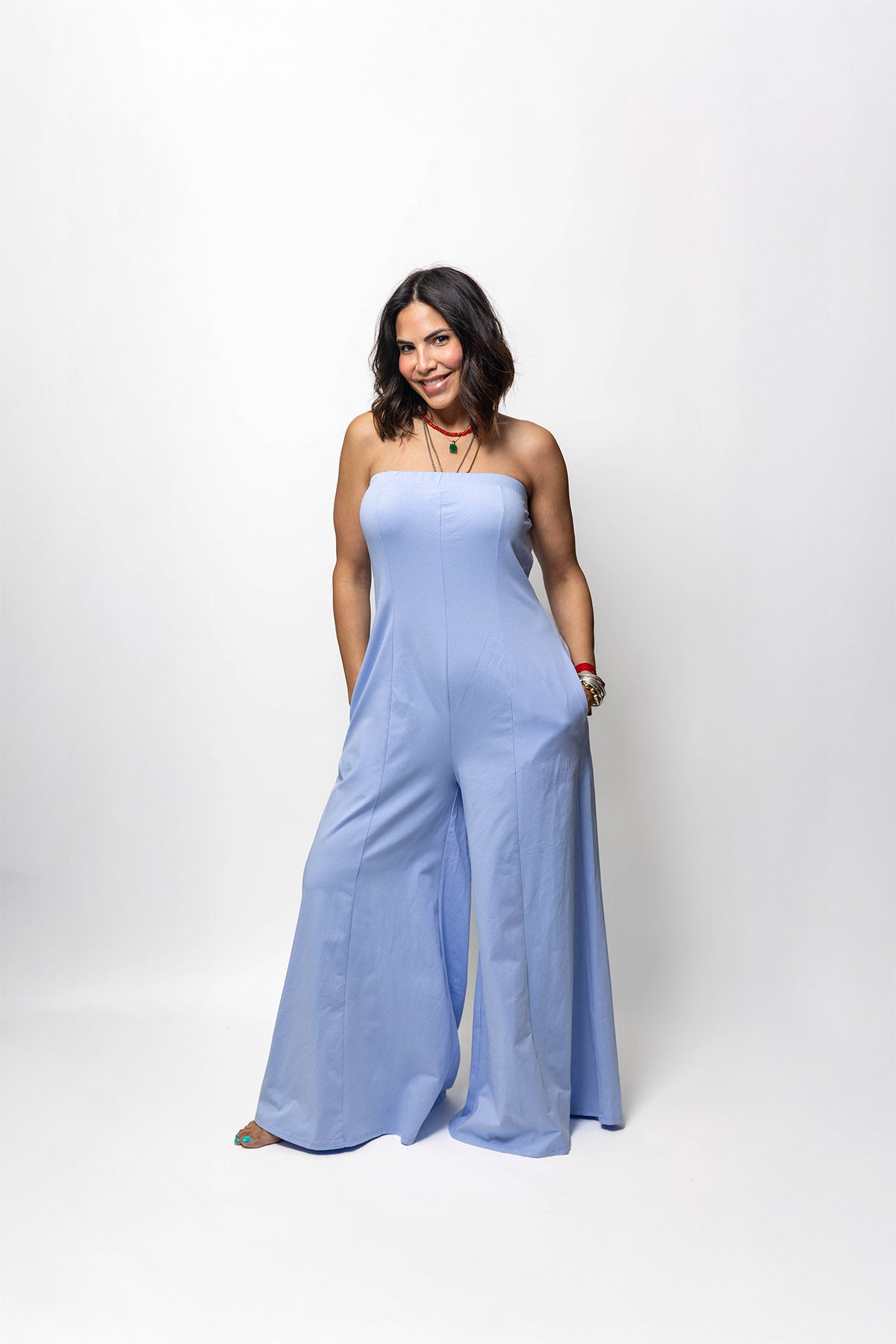 Flow through your day in this effortlessly chic strapless jumpsuit. Designed with a flattering fitted bodice and dramatic wide-leg silhouette, it offers comfort and style in one piece. Comes in vibrant coral and soft sky blue—perfect for brunches, events, or vacation vibes.