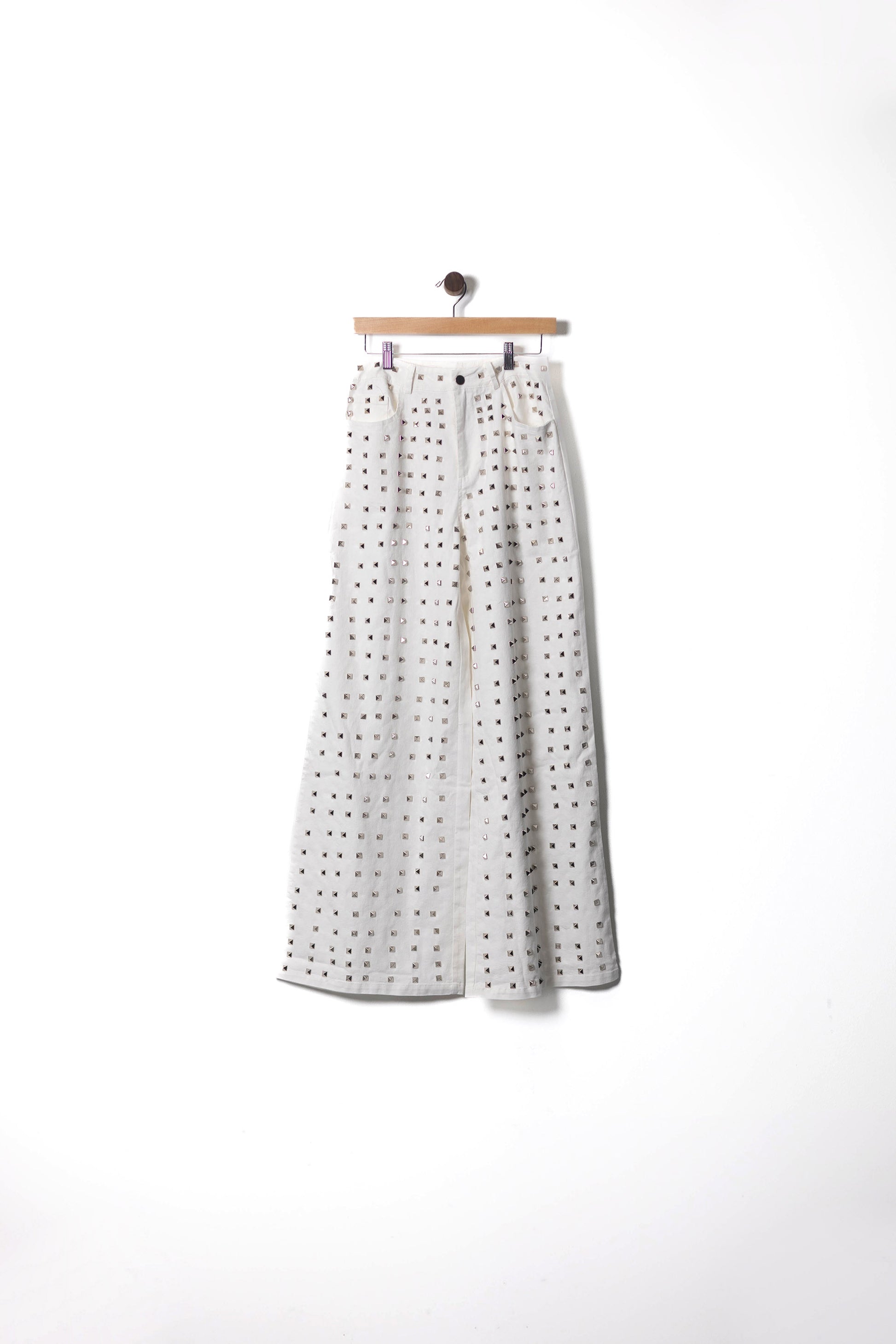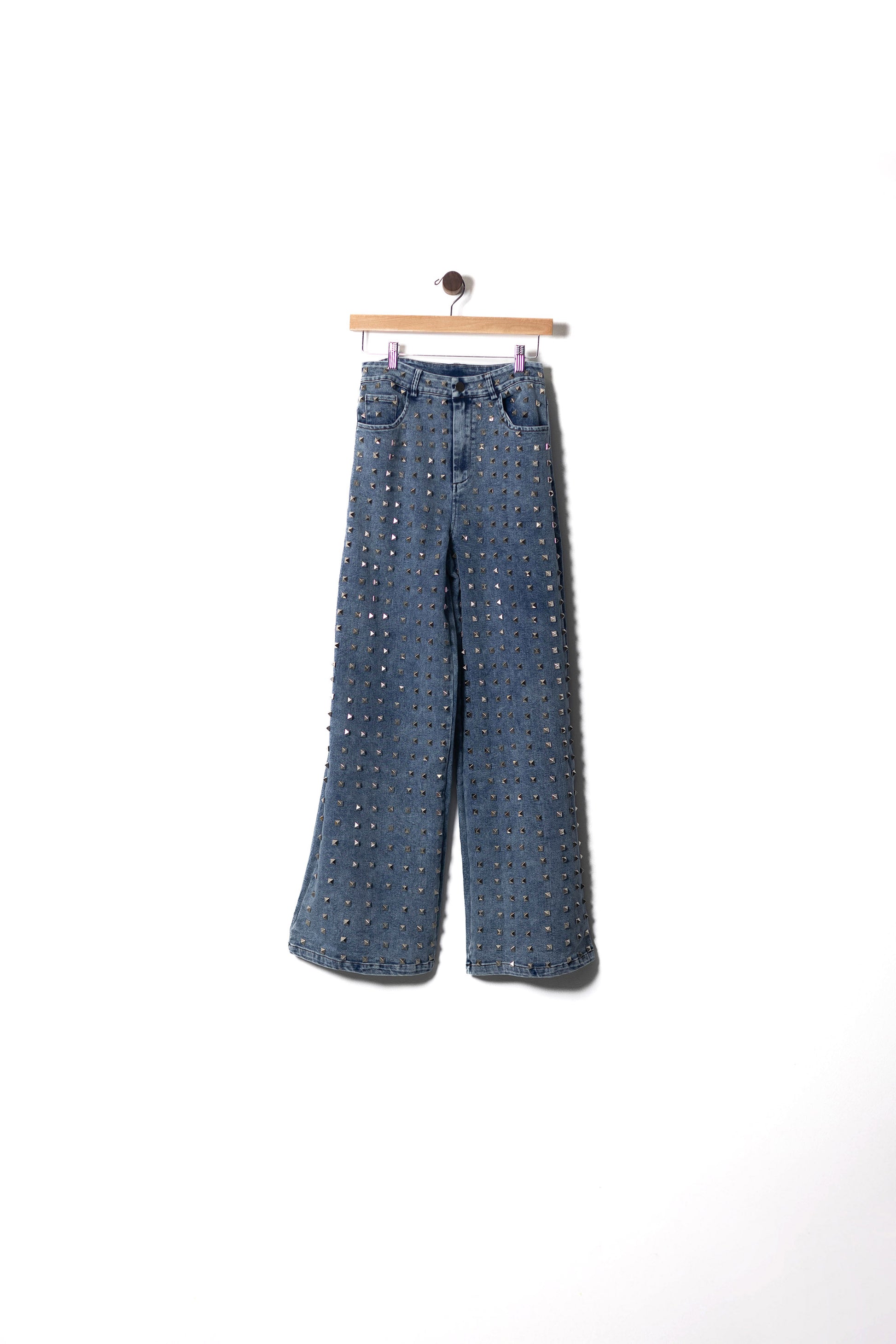Turn heads in these bold and edgy wide-leg denim pants, fully embellished with square silver studs for a statement-making look. Designed with classic 5-pocket styling and a high-rise waist, they bring a perfect mix of glam and grit. Style them with a tucked-in tee or a sleek bodysuit for effortless cool-girl vibes. Available in soft pink and sandy tan.
